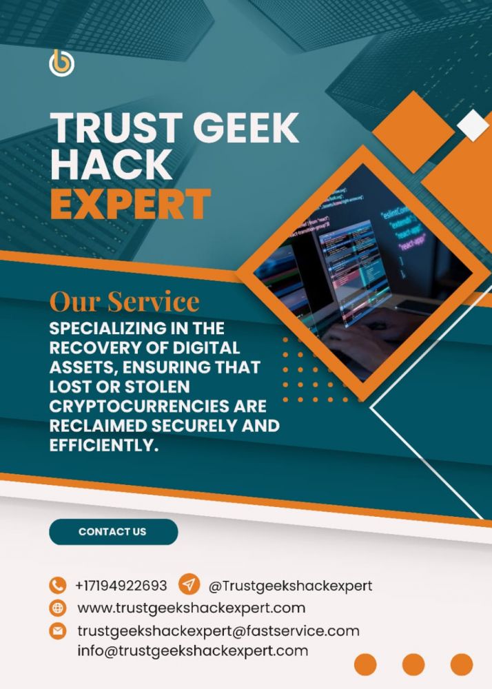 Living in the UK, I have always focused on making secure investments, and my decision to invest in Bitcoin was no different. With $680,000 stored in a hardware wallet, I felt well-prepared for the future. However, my confidence was shattered one fateful day when my hard drive suffered a catastrophic failure. Panic quickly set in as I tried every recovery method I could think of, but nothing worked. The sinking feeling in my stomach told me that my hard-earned Bitcoin might be lost forever. When I was at my wit’s end, a friend suggested I look into TRUST GEEKS HACK EXPERT. He had heard good things about them, especially their expertise in dealing with hard drive-related wallet issues. Skeptical but desperate, I decided to reach out. From the moment I contacted TRUST GEEKS HACK EXPERT website https :// trustgeekshackexpert . com/, I felt a wave of reassurance. Their team was not only knowledgeable but also genuinely concerned about my situation. They explained the data recovery process in a way that was easy for me to understand, which helped ease my anxiety. They patiently walked me through each step, ensuring they were dedicated to helping me retrieve my lost funds. After several tense days filled with anticipation, I received the astonishing news: they had successfully recovered my wallet. The relief I felt was indescribable; it was like I had just won the lottery. I was overwhelmed with gratitude for their incredible work and expertise. It felt like a miracle to regain access to my Bitcoin. If you find yourself in a similar predicament, whether in the UK or anywhere else, I wholeheartedly recommend TRUST GEEKS HACK EXPERT visit Website <> https :// trustgeekshackexpert . com/, Their dedication, expertise, and ability to deliver results are truly remarkable. They are not just a service; they are a lifeline for those facing the uncertainty of lost digital assets. Thanks to them, I can now look forward to a more secure financial future, knowing that my investments are safe once again. I am profoundly thankful for their support and commitment, which transformed what seemed like a financial disaster into a story of hope and recovery. TRUST GEEKS HACK EXPERT Tele Gram <> Trustgeekshackexpert